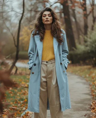 This outfit is the perfect mix of warm and cool tones. A mustard yellow knit sweater adds a cheerful burst of color, while the pastel blue trench coat offers an elegant contrast. Neutral wide-leg trousers keep the look grounded and structured. White sneakers add comfort and a casual touch, making the outfit both practical and stylish.