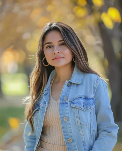 This outfit is a springtime dream! A flowing floral-print maxi skirt brings soft, romantic vibes, while a lightweight white knit top keeps things fresh and comfortable. The classic denim jacket adds a casual touch, perfect for layering on cooler spring days. Simple hoop earrings add a playful yet polished finish.