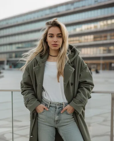 I love how this outfit feels so effortlessly cool! The oversized coat is perfect for layering on unpredictable spring days, and you can t go wrong with jeans and a tee combo. It s comfy, versatile, and great for anything from running errands to grabbing coffee with friends. Definitely a look that says, “I’m chill but still super stylish.”