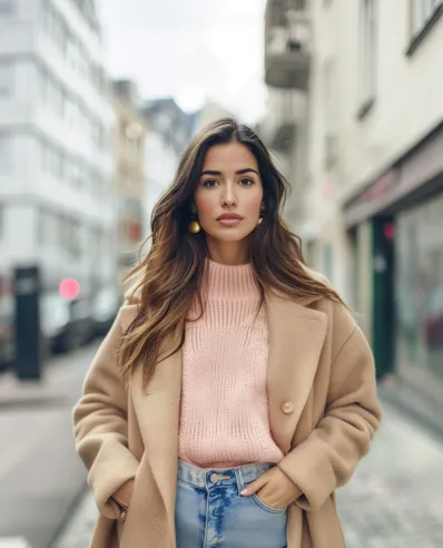 This look is all about soft hues with a casual yet stylish vibe. A blush pink chunky knit sweater brings warmth and softness, paired perfectly with light-wash high-waisted jeans that keep it relaxed. Over it all, a camel coat adds structure and elegance, creating the ideal layering piece for cooler spring days. Minimal accessories and subtle makeup keep the focus on the outfit’s harmonious colors.