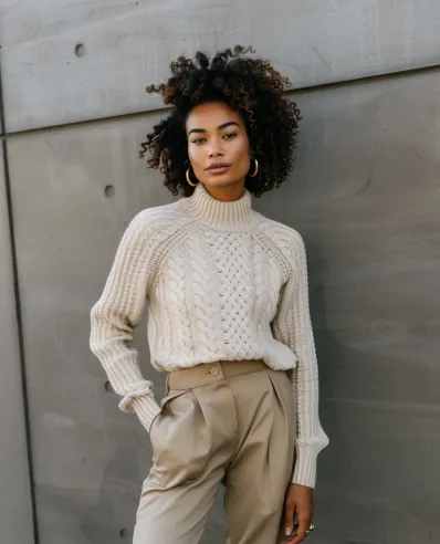 This look is the definition of polished comfort. The cream cable-knit turtleneck brings warmth and texture, perfect for chilly spring days. High-waisted beige trousers add a tailored element, giving structure and sophistication to the outfit. Simple gold hoops provide a touch of shine, making the whole ensemble feel effortlessly elevated.