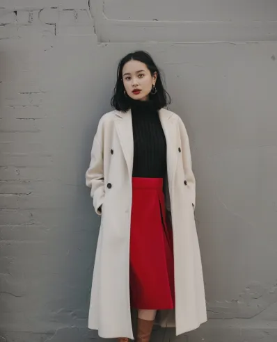 This look is bold yet sophisticated. A striking red midi skirt creates a vibrant focal point, balanced by a sleek black turtleneck for a chic contrast. The cream long coat adds elegance and softens the overall look, while tan knee-high boots give it a polished, put-together vibe. Red lips and subtle accessories perfectly complement the outfit, making it effortlessly stylish.
