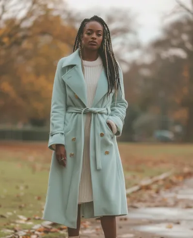 This outfit blends warmth and elegance in a fresh, pastel palette. A light blue belted trench coat creates a statement layer, perfectly complementing the ribbed cream knit dress underneath. The dress has a relaxed fit that feels comfortable yet classy. Chunky cream ankle boots give the look a modern, grounded edge without losing the polished vibe.