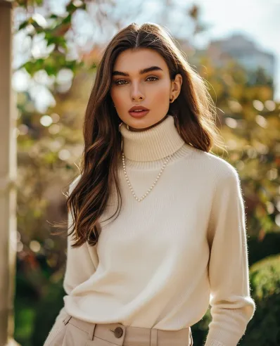 This outfit exudes timeless sophistication. A cream turtleneck sweater, paired with tailored beige trousers, creates a harmonious monochrome look. A string of pearls adds a subtle yet elegant touch, enhancing the refined aesthetic. The soft, neutral palette feels light and fresh, perfect for welcoming the spring season in style.