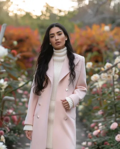 This outfit is the essence of graceful spring fashion. The blush pink coat offers a soft yet structured layer that instantly elevates the look. Underneath, a cozy cream turtleneck dress keeps you warm while adding a refined touch. Knee-high cream boots complete the ensemble, creating a harmonious, monochromatic vibe perfect for a stroll through blooming gardens.
