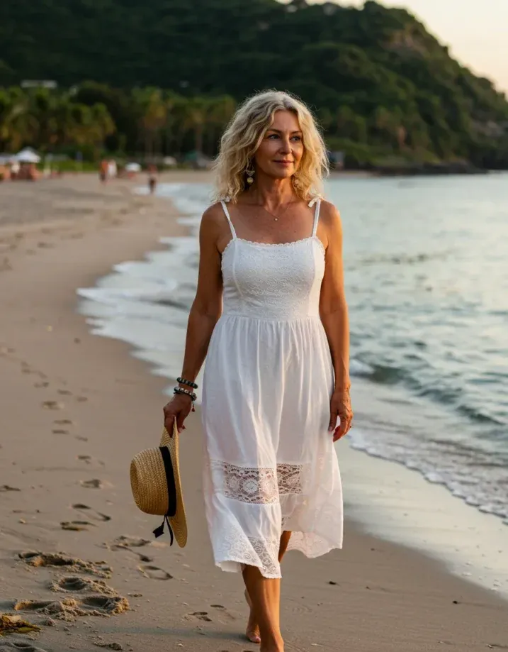 This outfit is what beach day dreams are made of. She s wearing a white midi sundress with delicate spaghetti straps, a fitted bodice, and soft eyelet lace detailing along the hem and across the skirt. It s flowy, breathable, and catches that golden hour breeze just right. She s walking barefoot in the sand, holding a straw hat casually by her side, with her beachy waves and natural jewelry adding a subtle boho touch.