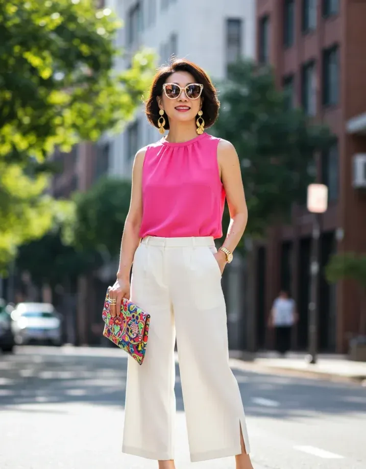 What I adore about this look is how confident and fun it feels. That pink is such a power color, and pairing it with crisp neutrals keeps the whole outfit looking fresh and elevated. It s the kind of outfit that turns heads and feels like sunshine in clothing form. Perfect for rooftop lunches, city strolls, or any moment where you want to feel fabulous in the heat.