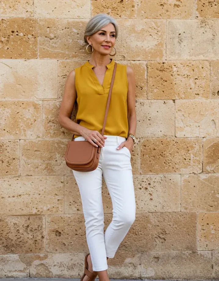 I love how warm and rich this color combo feels it s cheerful without being too loud, and the pieces are super versatile. The mustard top adds a pop of personality while the white pants keep it fresh and balanced. This is one of those looks that works just as well for sightseeing on vacation as it does for lunch dates or casual Fridays. It s sunny, stylish, and just feels so put-together without trying too hard.