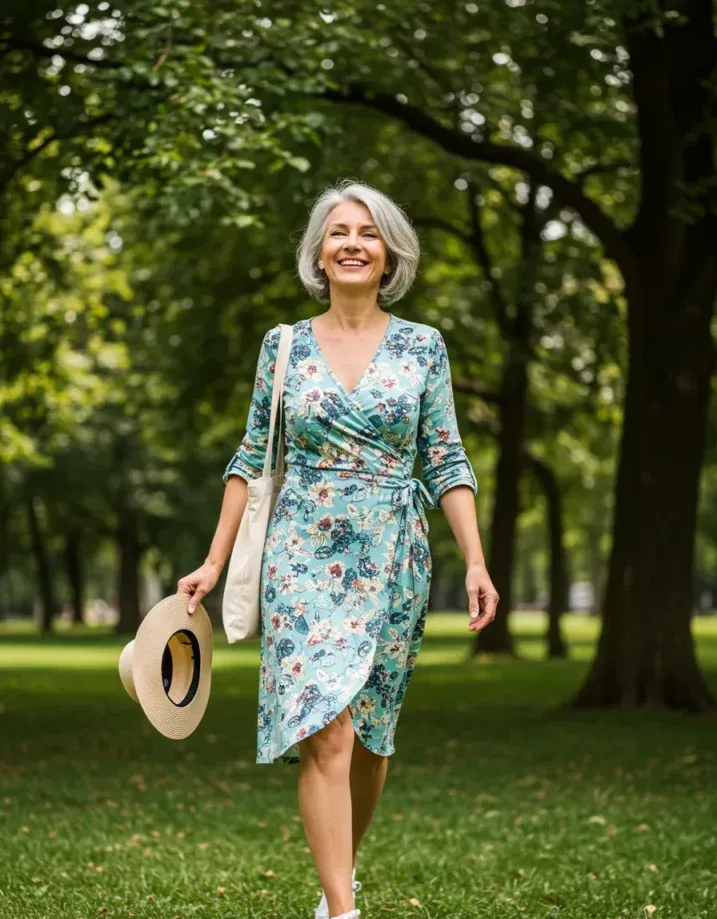 This outfit is the definition of pretty-meets-practical. She s wearing a wrap-style dress in a lovely light teal with a soft floral pattern and three-quarter sleeves. The shape hugs just enough without feeling tight, and the front tie keeps things flattering and adjustable. She s paired it with crisp white sneakers that make the look feel young and playful, plus she s carrying a neutral tote and holding a straw hat like a summer styling pro.