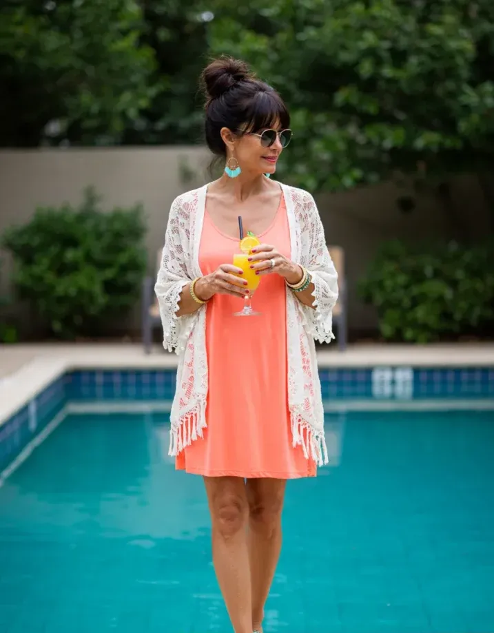 This outfit is basically what a tropical smoothie would wear if it could. She s got on a flowy coral sundress that s lightweight, comfy, and the perfect punch of color. Over it, she s layered a white crochet kimono with fringe detailing that brings just enough boho flair. Her jeweled sandals are playful and cute, and the turquoise statement earrings are giving full-on summer goddess energy. Add in stacked bangles, big sunglasses, and a messy bun, and you ve got a poolside look that s part glam, part chill.