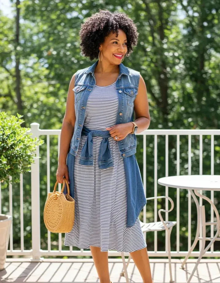 This look is sunshine-ready with a side of laid-back charm. She s wearing a navy and white striped sleeveless midi dress that s easy, breezy, and totally twirl-worthy. On top, she s layered a sleeveless denim vest for a touch of structure and tied a lightweight chambray shirt around her waist to keep it playful. The accessories are giving summer brunch energy neutral espadrille wedges, a round straw bag, and gold hoops that pull it all together.