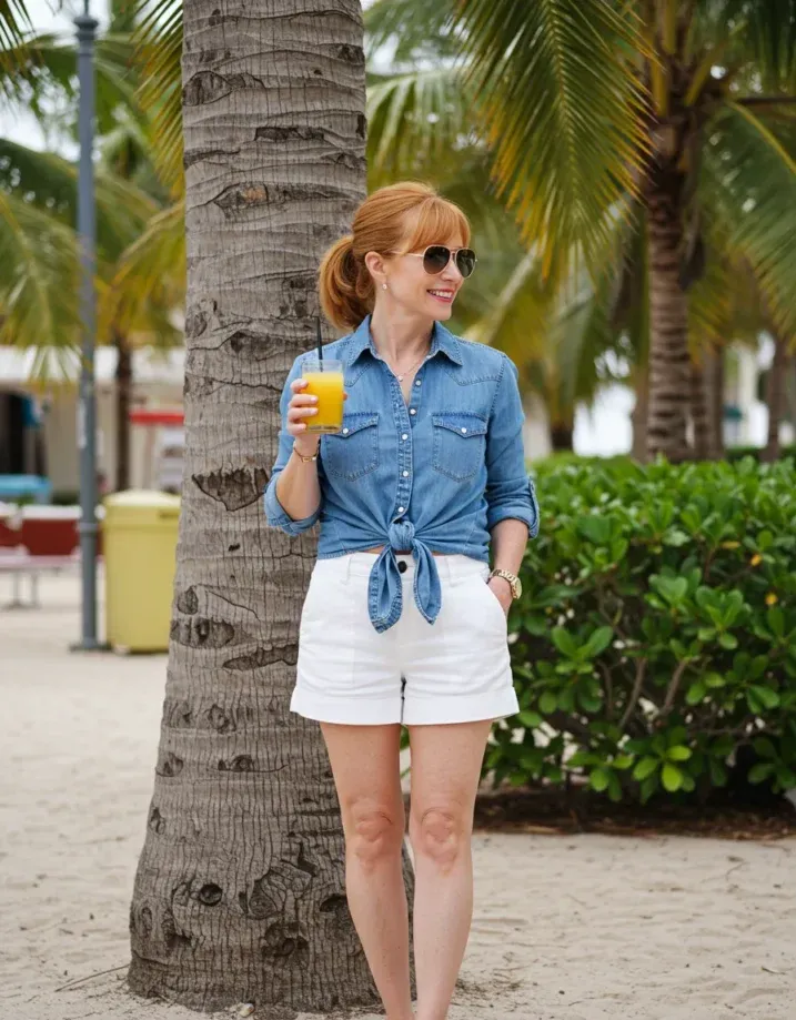 This outfit is laid-back perfection with a touch of beachy charm. She s wearing a classic chambray button-up shirt tied at the waist for a relaxed and playful vibe. Paired with crisp white shorts, the whole look feels fresh, clean, and ready for warm weather. The rolled-up sleeves and the knotted hem make the shirt feel a little less structured, while nude strappy sandals and aviator sunglasses keep it casual-chic. Bonus points for that ice-cold drink in hand hello, vacation mode.