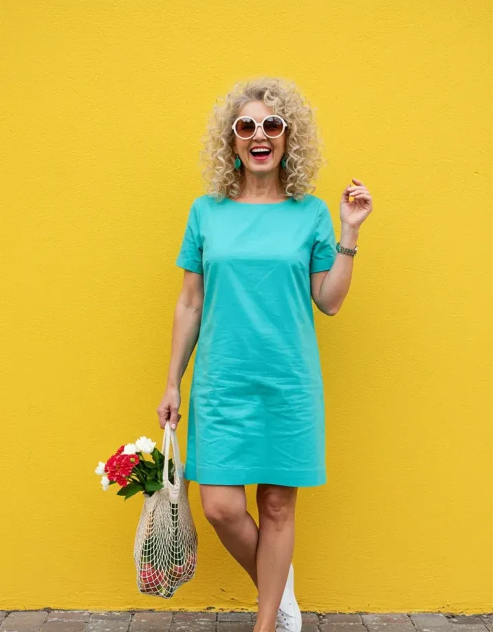 This outfit is pure sunshine and smiles. She s rocking a bright aqua T-shirt dress that hits just above the knees and feels like the definition of throw-it-on-and-go. It s simple, comfy, and makes a bold statement all on its own. She s paired it with classic white sneakers and accessorized with oversized round sunglasses, turquoise earrings, and a net market bag filled with colorful flowers because obviously she s out here living her best life.