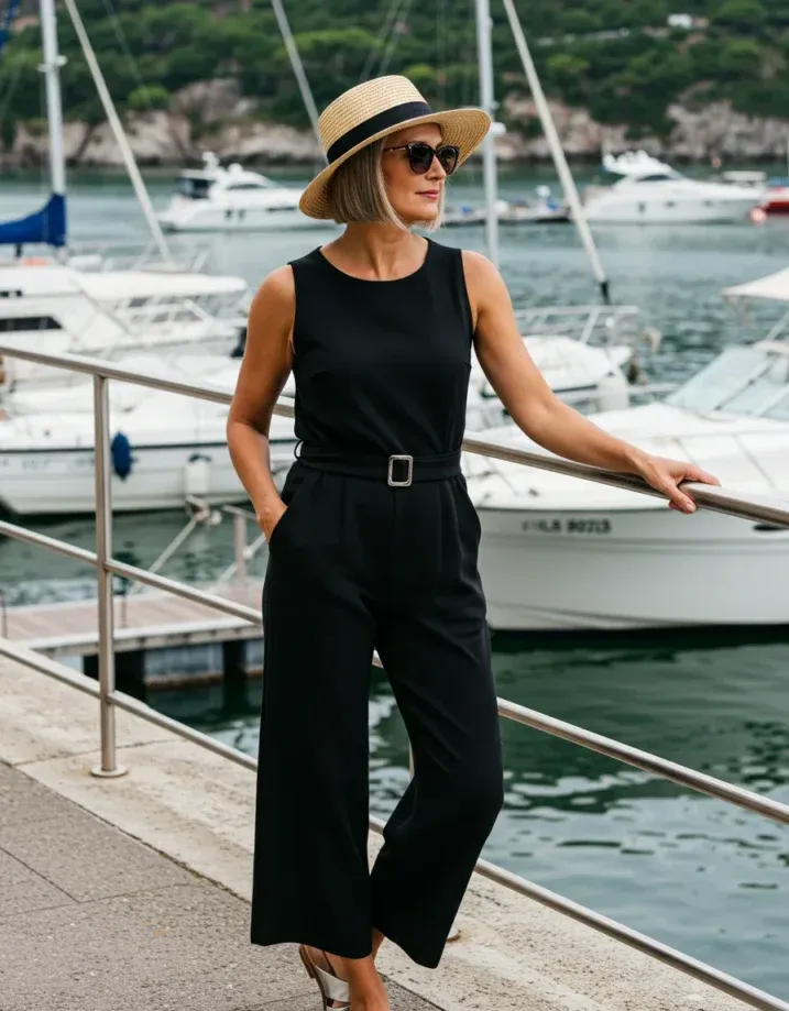 This outfit is nautical-chic with a serious dose of elegance. She s wearing a black sleeveless jumpsuit with a belted waist and wide-leg cropped pants that give the whole look structure without feeling stuffy. The fabric flows just enough, and the high neckline keeps it looking polished. She finishes the look with silver buckle sandals, oversized sunglasses, and a wide-brimmed straw hat that s giving total Riviera vibes.