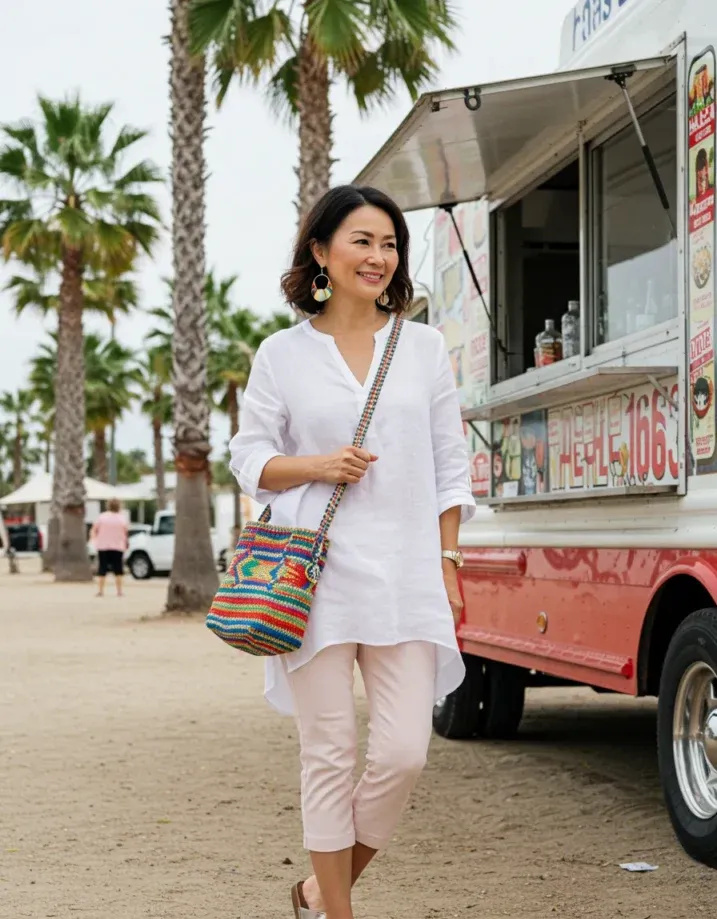 This outfit is beachy, breezy, and totally fuss-free. She s wearing a long, relaxed white tunic top with a flattering neckline and rolled-up sleeves hello, casual chic. It s paired with pale blush cropped pants that keep things light and breathable. Metallic sandals add a little shine, while her rainbow-striped woven crossbody bag and playful statement earrings bring all the fun and color to the look.