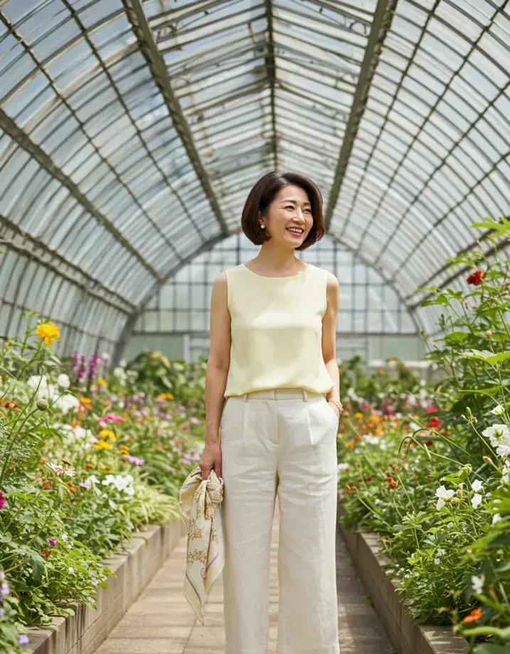 This outfit is basically sunshine in clothing form. She s wearing a buttery yellow sleeveless top tucked neatly into high-waisted cream linen trousers with a relaxed wide-leg fit. The pants fall just above the ankle, giving it that light and airy summer feel. She s paired it with simple beige flats and a delicate patterned scarf that she s carrying in hand like a stylish little secret. Her short, sleek bob and pearl earrings add a polished touch without trying too hard.