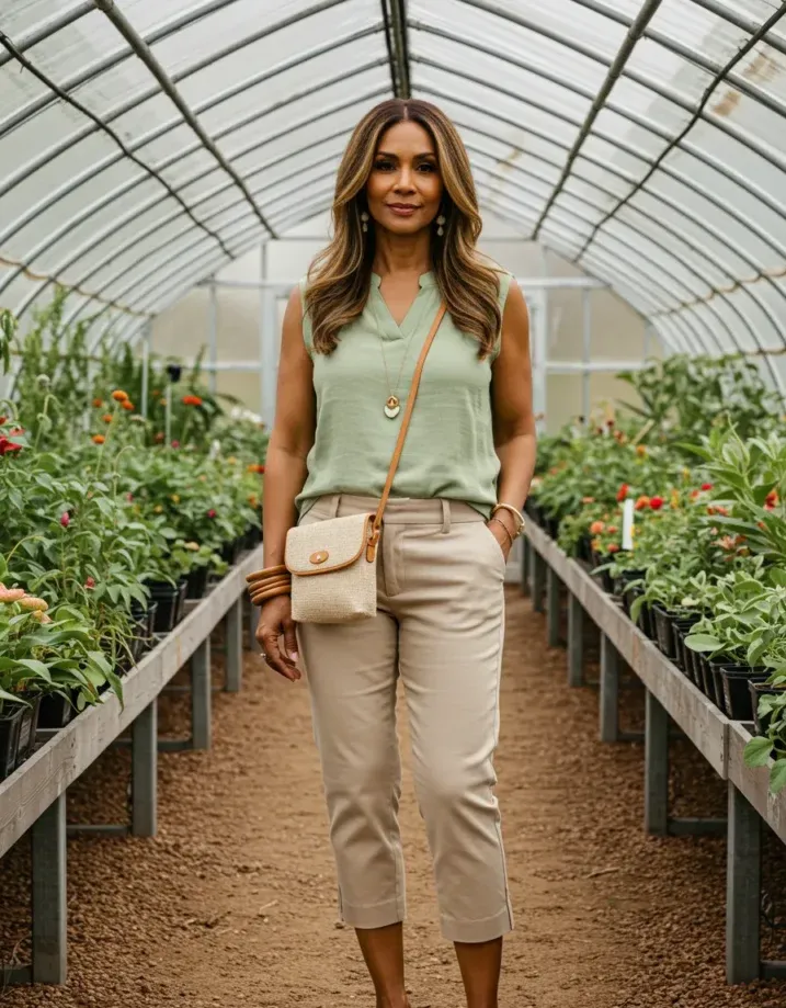 This look is calm, comfy, and totally ready for warm days spent outdoors. She s wearing a sleeveless sage green blouse with a flattering V-neck, neatly tucked into cropped khaki pants that hit right above the ankle. The outfit is soft and earthy, and the accessories keep that vibe going strong a woven beige crossbody bag, tan woven slide sandals, and simple gold jewelry to elevate it all just a bit.