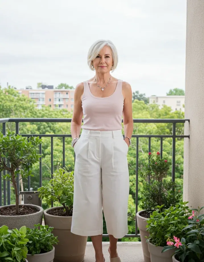 This outfit is proof that simplicity can be stunning. She s wearing a soft blush pink tank top tucked into high-waisted white culottes that fall mid-calf and have the loveliest tailored shape. The minimal color palette makes the whole look feel light, calm, and put-together without trying too hard. She s styled it with nude slide-on heels, a delicate silver necklace, and bracelets that add a subtle sparkle.