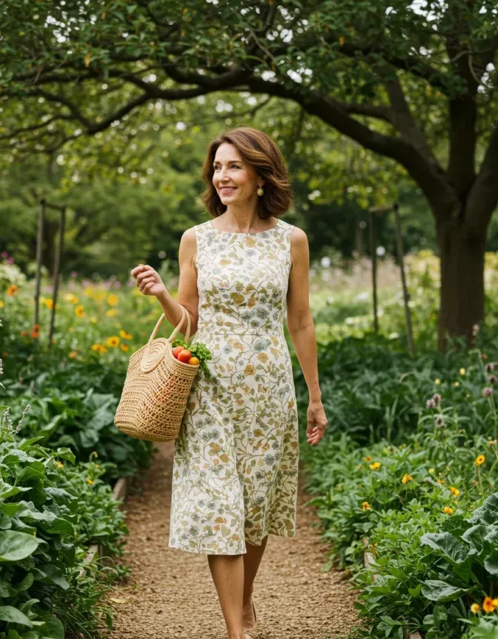 This outfit is like a peaceful garden stroll wrapped in fabric. She s wearing a sleeveless midi dress in a soft botanical print, featuring gentle greens, creams, and earthy tones that blend beautifully with the lush garden setting. The dress is fitted just enough to flatter without feeling tight, and it moves effortlessly as she walks. She pairs it with nude ballet flats, dainty earrings, and a straw tote that s filled with fresh produce because of course she s stylish and practical.