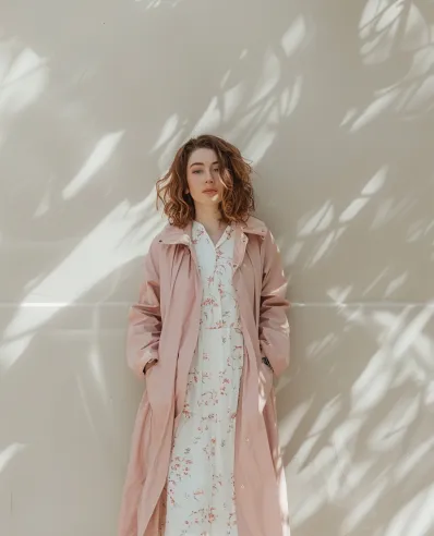 This outfit is pure romance wrapped in practicality! The soft blush pink raincoat flows beautifully over a delicate white midi dress with subtle floral patterns, creating a dreamy, feminine aesthetic. Paired with classic white sneakers, this look balances elegance and casual charm, making it ideal for a day out in light rain or misty spring weather.