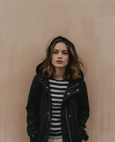 This outfit channels effortless Parisian vibes with a modern twist. The black raincoat provides a sleek and functional outer layer, while the striped navy-and-white top adds a timeless, nautical feel. Paired with cream-colored jeans, the look is light and balanced, perfect for those in-between weather days. The hood adds a practical touch, making it ideal for a light drizzle or a breezy day.