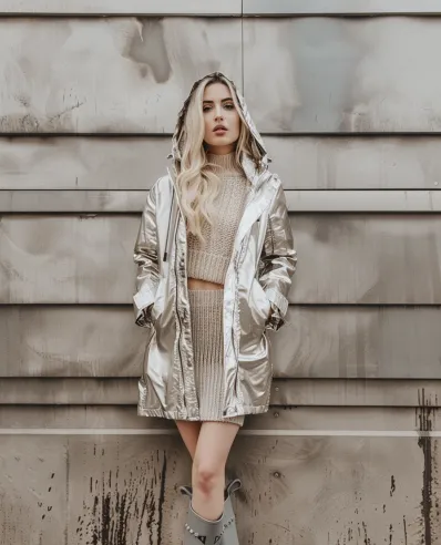 Metallic Silver Raincoat with Knitted Co-Ord and Grey Boots