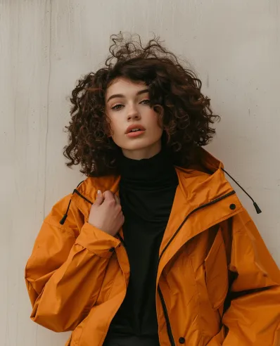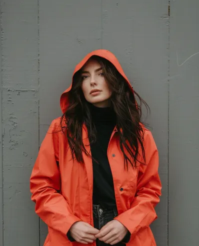 This outfit is all about making a statement in the rain! The vibrant orange raincoat instantly catches the eye, injecting a dose of energy and personality into any gray day. Paired with a sleek black turtleneck and dark denim, this look keeps the base simple, letting the bold outer layer shine. The hooded design adds practicality, ensuring you stay both dry and stylish.
