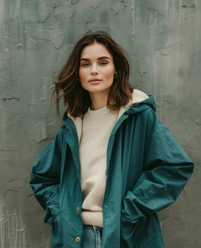This outfit is a perfect mix of cozy and casual! The rich teal raincoat adds a refreshing pop of color while offering protection from the drizzle. Underneath, a cream knit sweater keeps things warm and textured, perfectly paired with light-wash, slightly distressed jeans for a laid-back, effortless vibe. It s the kind of look that works for anything from running errands to enjoying a walk in the rain.