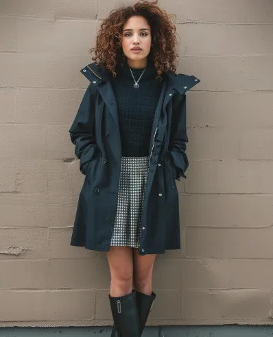 Navy Raincoat with a Plaid Skirt and Knee-High Boots