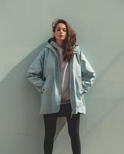 This look is the perfect blend of sporty and chic! The oversized powder blue raincoat adds a soft pop of color, layering effortlessly over a cozy gray hoodie for a relaxed, casual vibe. Black leggings keep the silhouette streamlined, while classic white sneakers complete the outfit with a touch of sporty freshness. It’s the ideal rainy-day look for staying comfortable and stylish while on the go.