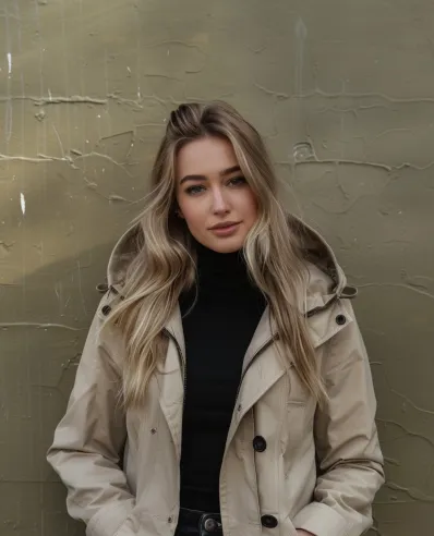 Beige Hooded Raincoat with a Black Turtleneck and Jeans