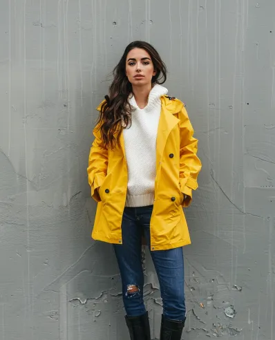 This outfit is a ray of sunshine on a cloudy day! The bold, cheery yellow raincoat is paired perfectly with a cozy white knit sweater, giving the whole look a warm and inviting vibe. Skinny jeans with a slightly distressed detail add a laid-back edge, while the knee-high black rain boots tie it all together with a touch of practical chicness. This combo screams “effortlessly stylish” while keeping you fully prepared to tackle the rain in comfort and charm.