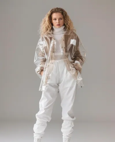 This outfit is futuristic fashion at its finest! The transparent raincoat allows the crisp all-white ensemble underneath to shine through while adding a modern, edgy vibe. A white turtleneck and jogger pants keep things sleek yet comfortable, while the chunky white lace-up boots give it an extra dose of boldness. The monochrome palette feels fresh and elevated, making this a head-turning look for any rainy day.