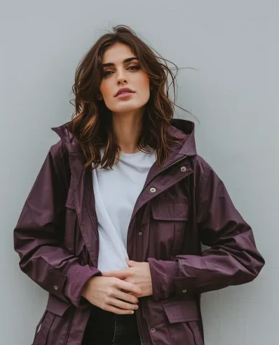 This outfit is all about subtle sophistication with a pop of rich color. The deep plum raincoat adds a refreshing twist to the classic rainwear look, perfectly paired with a crisp white tee and sleek black jeans. The structured fit of the coat combined with its functional pockets makes it practical yet effortlessly stylish. It’s an outfit that feels modern and versatile for any casual rainy-day adventure.