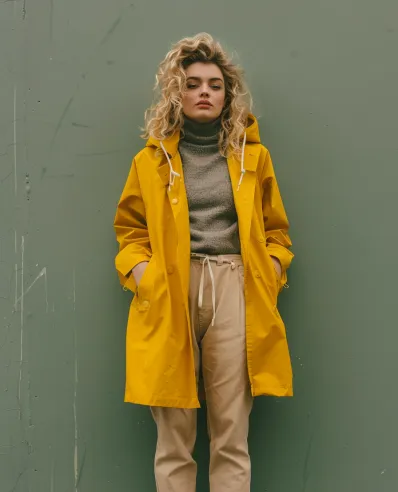 This outfit is like sunshine on a cloudy day! The bright yellow raincoat is the star of the show, radiating positivity and energy. Underneath, a cozy gray turtleneck and high-waisted beige trousers create a neutral, earthy base that complements the vibrant outer layer. The white sneakers keep things casual and comfy, making this look perfect for a relaxed yet stylish rainy-day outing.