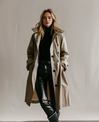 This outfit is the epitome of understated elegance. The long beige trench coat is timeless and effortlessly chic, paired with a sleek black turtleneck and faux leather pants for a modern, polished look. Tall black rain boots with a slight heel complete the outfit, balancing practicality with style. The neutral palette and tailored silhouette make this ensemble versatile, whether you’re heading to work or out for a casual stroll.