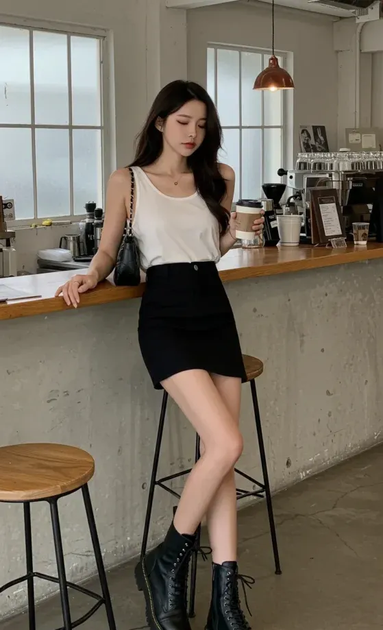This outfit is the perfect blend of casual and chic! The model is wearing a simple white tank top paired with a black mini skirt, creating a sleek yet laid-back vibe. The look is topped off with black combat boots, which add an edgy touch, and a black bag to tie everything together. With a coffee in hand, this outfit screams effortless style, making it perfect for a quick coffee run or a day out with friends.