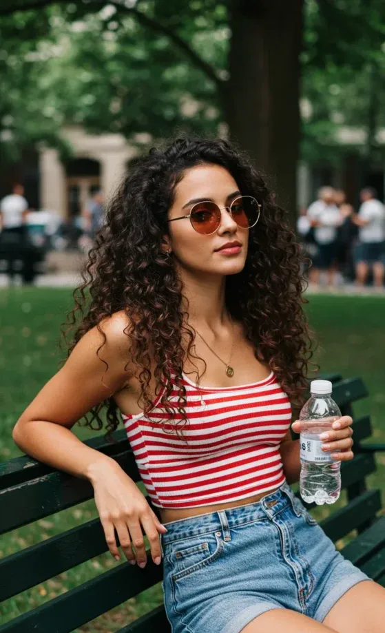 This outfit perfectly captures that carefree summer spirit with a striped, sleeveless crop top paired with high-waisted, distressed denim shorts. The red and white stripes bring in a playful, fresh vibe, while the denim shorts give the look a laid-back, cool feeling. Paired with some sunglasses and a bottle of water, the overall look screams effortless chic. The natural curls and simple jewelry keep the focus on the outfit, making it both fun and stylish without trying too hard.