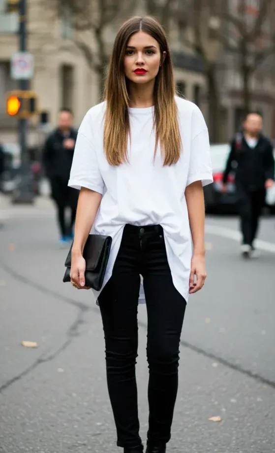 This effortless yet bold look is a stunning mix of casual chic and edgy vibes. A loose, white oversized t-shirt tucked into high-waisted black skinny jeans creates a laid-back silhouette. Paired with black ankle boots and a simple black handbag, this outfit radiates confidence without overdoing it. The addition of bold red lips and gold accessories adds just the right amount of drama, taking the outfit to a whole new level.