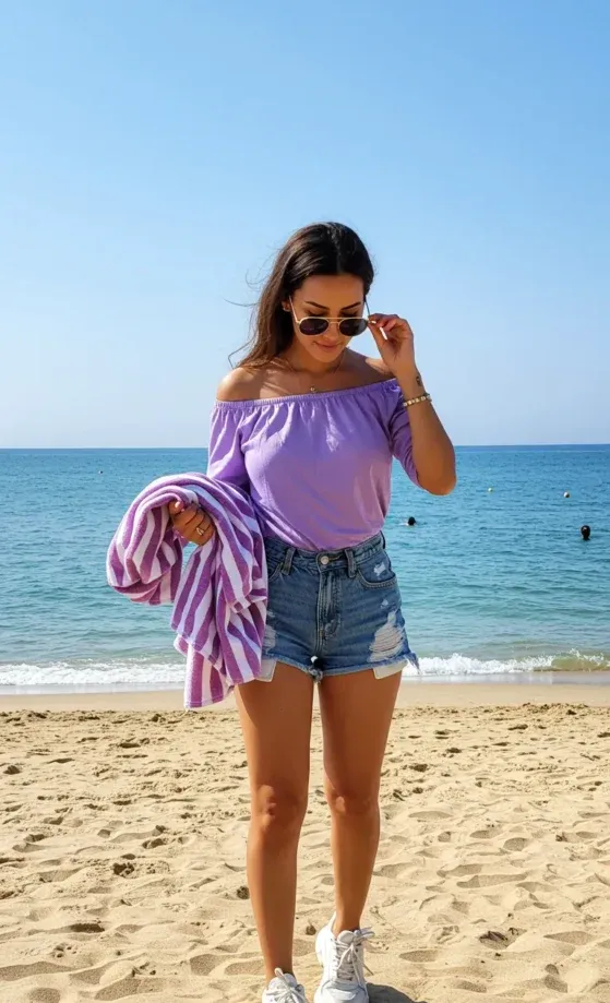 This summer-ready outfit is giving me all the beach vibes! The model is sporting a cute off-the-shoulder lavender top paired with distressed denim shorts, perfect for those sunny beach days. A striped towel is casually draped over her arm, adding a laid-back, fun touch to the look. Completing the ensemble are comfy white sneakers and trendy round sunglasses, making it both fashionable and functional.