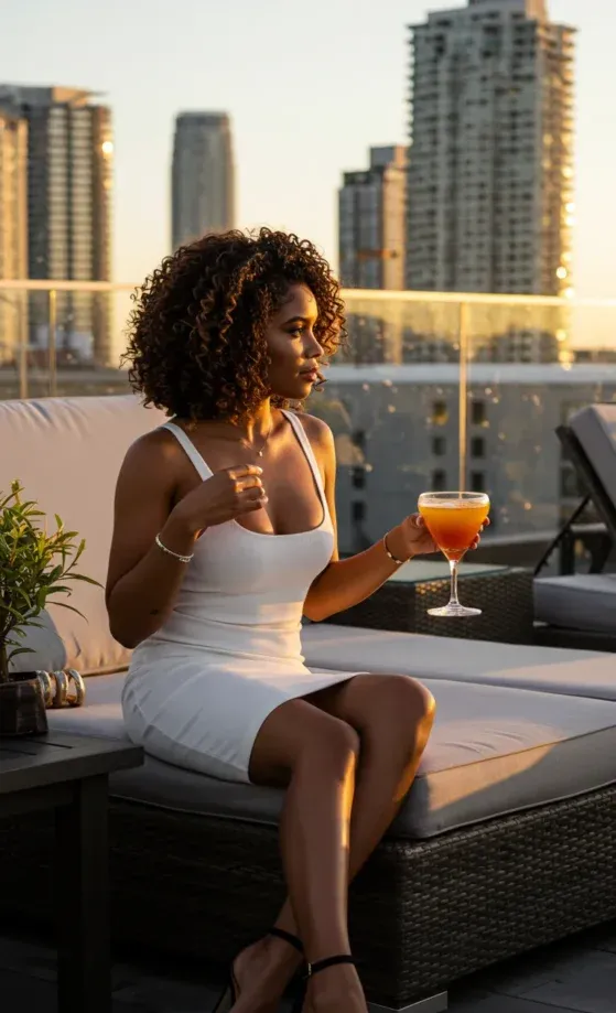 This stunning look is perfect for a rooftop evening out! The model is wearing a simple yet elegant white bodycon dress, which is both flattering and stylish. The minimalistic design is complemented by strappy black heels and a cocktail in hand, creating a refined yet playful vibe. The soft lighting from the sunset adds a glowing warmth to the outfit, making it even more captivating against the urban backdrop.