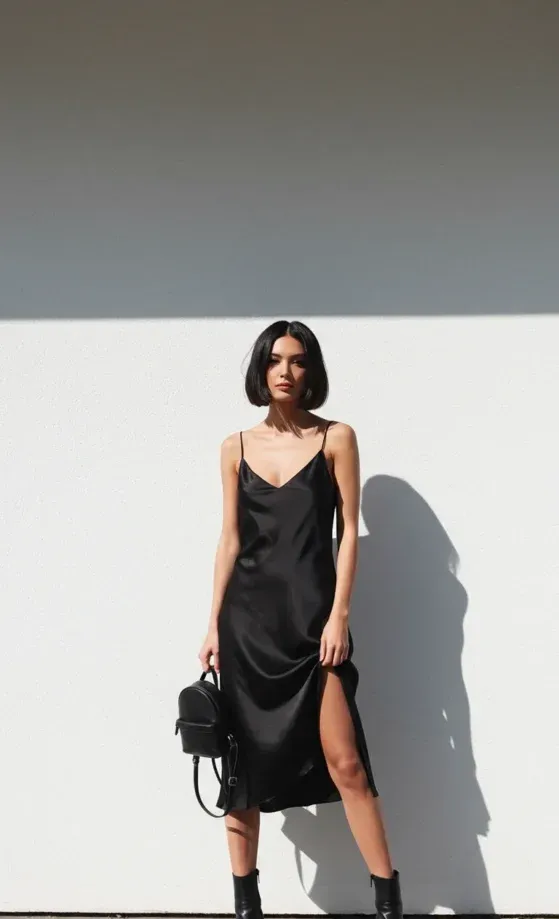 This outfit is pure sophistication! A black satin slip dress with delicate spaghetti straps creates a sleek, minimalistic look that exudes elegance. The side slit adds just the right amount of sultriness, while the black boots and mini backpack give the outfit an edgy, modern vibe. This perfect blend of sexy and chic makes it ideal for a night out in the city.