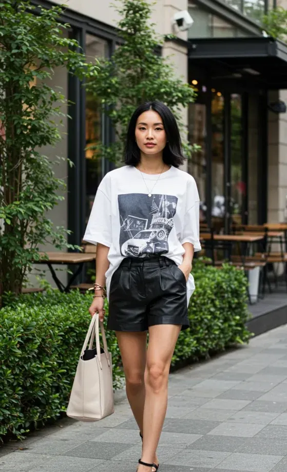 This chic baddie summer outfit is perfect for showing off that laid-back, yet stylish vibe. The outfit features a white graphic tee with a bold design paired with black leather shorts that add an edgy twist. To finish the look, the model carries a beige handbag and wears black strappy sandals that highlight her polished, minimalistic style. The relaxed fit of the tee balances perfectly with the structured leather shorts, giving the outfit an effortlessly cool feel.