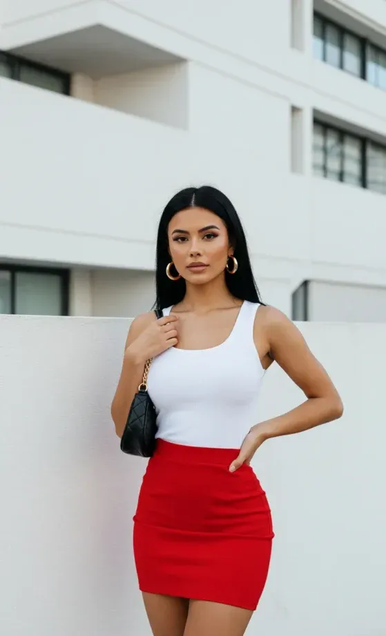 This outfit is effortlessly chic and perfect for showing off some bold style. The model is wearing a classic white tank top tucked into a high-waisted red mini skirt that fits like a glove, creating a flattering silhouette. She s accessorized with oversized hoop earrings, a chic black handbag, and paired the outfit with simple yet stylish sandals. The minimalist yet striking combination of red and white gives it a timeless appeal, making it perfect for a casual day out.