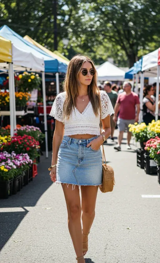 This breezy summer outfit is perfect for strolling through a vibrant outdoor market. The model is rocking a white lace crop top with delicate details paired with a classic denim skirt, offering a laid-back yet chic vibe. A woven handbag and nude sandals complete the look, keeping it both stylish and comfortable for a day out in the sun. The round sunglasses add a touch of coolness, making it the ideal look for casual summer fun.