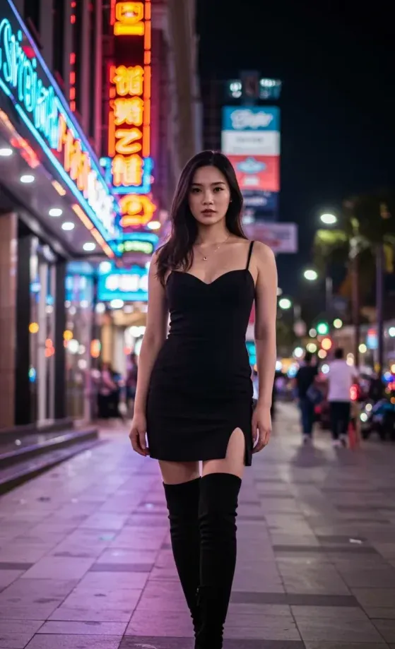 I m obsessed with how this outfit combines sultry elegance with urban edge. The black dress is a classic, but the thigh-high boots take it to a whole new level of fierceness. It’s perfect for a night out when you want to make a statement and feel amazing while doing it. Plus, the contrast of the dress with the colorful city lights makes it feel even more dynamic and exciting!