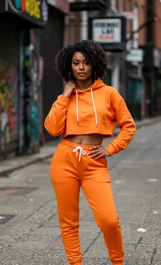 This outfit is giving major street style vibes with an extra pop of color! The model is rocking an orange cropped hoodie with matching joggers, creating a casual yet stylish look that s perfect for the warmer months. The outfit is balanced out with classic white sneakers, making it both comfortable and chic. The cropped hoodie and drawstring joggers give it a relaxed, sporty feel, while the bold orange color adds a fun and energetic vibe.