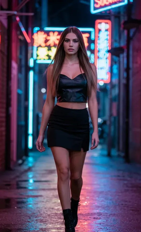 This outfit screams bold and trendy with a sleek leather crop top paired with a high-waisted black skirt. The model adds an edge with chunky combat boots that stand out against the stylish minimalism of the top and skirt. The outfit is finished off with simple accessories, making it a powerful and fashion-forward look. The neon-lit alley and rainy streets add a touch of mystery, perfectly complementing the vibe of the outfit.