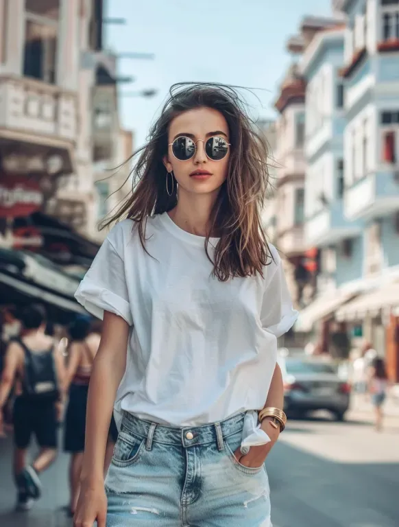 This outfit is the definition of cool and laid-back. A classic white oversized tee pairs perfectly with distressed denim shorts that add just the right amount of edge. The look is finished off with a trendy pair of oversized sunglasses, gold hoop earrings, and a bracelet, making it chic yet understated. This outfit is simple enough for everyday wear but still stylish enough to turn heads.