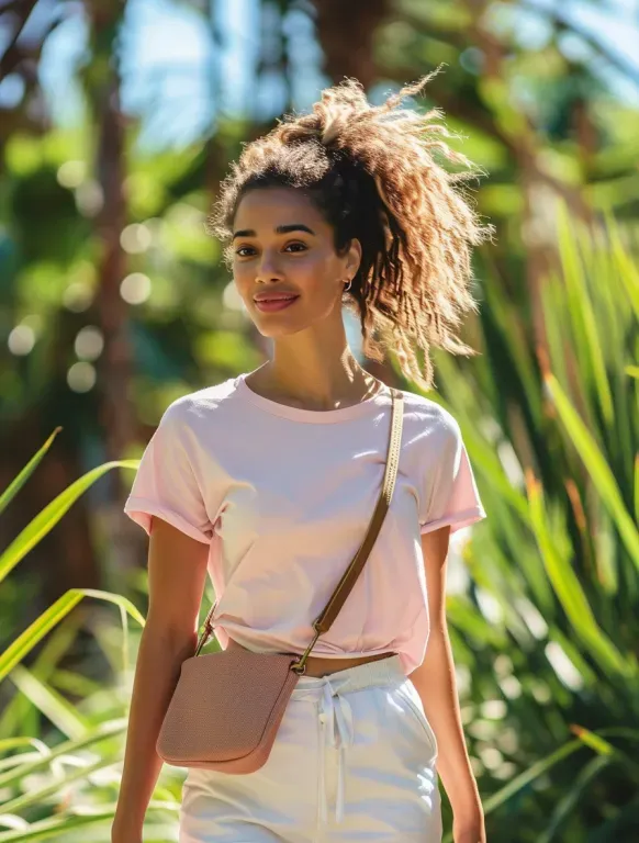 This outfit is the perfect combination of simplicity and style. A soft pastel pink t-shirt is tucked into white high-waisted shorts with a drawstring, giving it an easy, breezy feel. A small crossbody bag adds a touch of practicality, while keeping the outfit casual yet chic. The natural background of greenery makes the outfit feel fresh and relaxed, perfectly capturing the essence of summer.